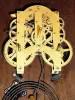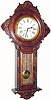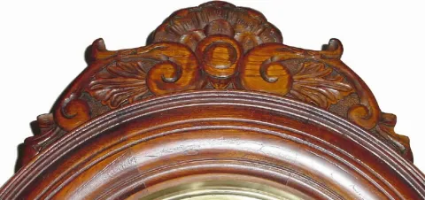in good condition, with some restoration. Patterned after large American wall regulators that sold successfully, this design gives you a lot of "Look" for the dollar, and the quality is nicer than similar large clocks imported from Asian companies today. The oak case has nicely detailed carvings (removable for shipping) around the dial and on the base, and retains its original finish that has been nicely waxed. The 8-day Ansonia type movement (Asian copy) is clean and running, strikes the hours on a coiled wire gong. Unfortunately the original dial got damaged and someone pasted a new paper dial to a piece of pressed wood, and glued it into the oak bezel. To make servicing the movement easier, they added top hinges to the bezel; you simply remove the hands and lift the bezel for access. The consignor paid $1100 for this clock, being reassured by his local auctioneer that it was American. Height 53"