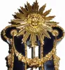 clock in very good condition. L'Epee obtained a license to sign the dial and rear case cover with the name LeRoy, Paris; the movement itself with L'Epee stamp. This clock seems to be in good order and has been running here for several weeks....a little tricky setting the pendulum in motion, but once it settles down, the brilliants swing briskly from side to side. The case is imitation marble with cobalt blue finish (some minor blemishes), and the ormolu trim is all brightly gilded. When new, these retailed for just under $5000, about the cost of an old one. This one has lots of flash for a considerably lower estimate. Height 22"