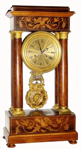 C.1865, French, 4-Column Empire Clock, as-found in fair to good condition. This photogenic clock has some veneer chips on the case, and the carcass has warped a bit and split the veneer in a couple other places; something has stained the veneer around the bird inside the portico. There is some worm damage on base, mostly on the left side, however none appears to be active at this time. The well made bell strike movement has an engine turned brass dial on which the gilding is worn. Apparently the original pendulum got displaced and a repairman drilled half dozen holes in cock trying to find the right length for this period pendulum. When excellent, these tend to bring around $1500. Height 19 1/2"