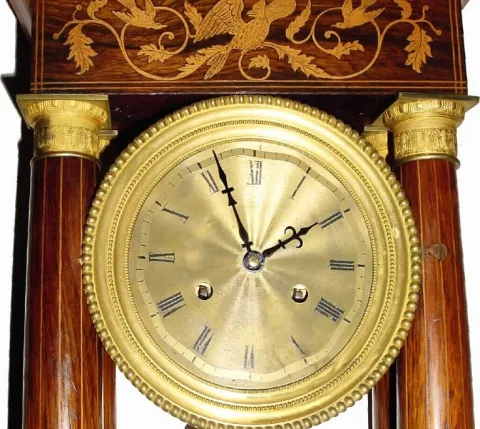 This photogenic clock has some veneer chips on the case, and the carcass has warped a bit and split the veneer in a couple other places; something has stained the veneer around the bird inside the portico. There is some worm damage on base, mostly on the left side, however none appears to be active at this time. The well made bell strike movement has an engine turned brass dial on which the gilding is worn. Apparently the original pendulum got displaced and a repairman drilled half dozen holes in cock trying to find the right length for this period pendulum. When excellent, these tend to bring around $1500. Height 19 1/2"