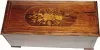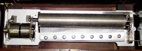 the music movement not original to the case. This is a great sounding box with no broken teeth and good dampers. But it has lost it's display cover and dust boards inside the case. The tune change lever and start stop have been extended out the right side of the case, and the inside controls are absent. It was originally a Paillard box with "through the case retainer bolts", and those holes have been filled with sections of dowel. Has an extra strong double spring motor, and well made nickel plated 13" cylinder that plays an assortment of Waltzes, marches and arias. Despite its lack of originality, it will please someone to own this box. Width 23", ht 9"