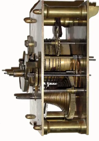 with 24" dial, in need of restoration, but certainly the most substantial fusee clock you will ever see. The movement (measuring 8 x 9 1/2 ") has a 4" spring barrel and a fusee to match, plus Graham style dead beat escapement, and mounts in the case on a large seat board. The case itself is brass and brass veneer over wood. The entire assembly is well over 100 pounds. The retaining screws for the original hands have been lost and the pendulum is a replacement. Absolutely NO commercial shipping on this piece; must go by blanket wrap or be picked up in person. Height 30"