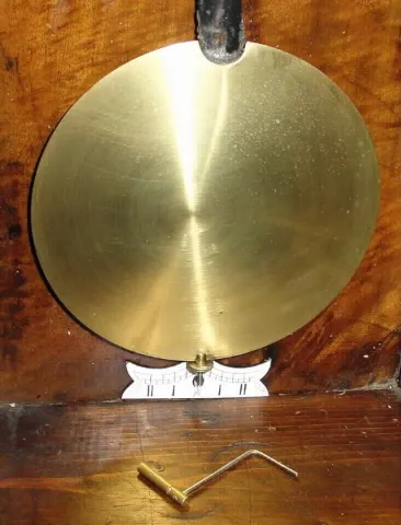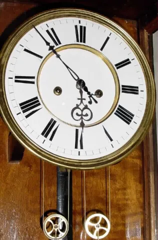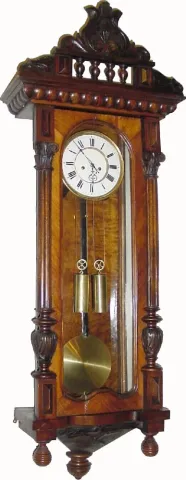 The well made Viennese movement is of high quality and mounts in the walnut case on a wooden slide. The well made hour hand is original; minute hand an old stamped replacement. Veneer in the case back had some separation bubbles. Door with some dry splits and veneer bubbles also. Old top with repairs. Clock seems to run reliably and is still OK for the price conscious buyer. Height 48"