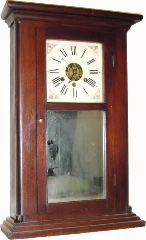 This clock is hard to read. It appears to be a handcrafted case in solid mahogany. The case work is nicely done and has enough age to be period. The door glass and mirror are old. It looks like an example that you might find by one of the Massachusetts makers like Charles Stratton; retains dust board over pulleys at top. The dial is clean but the two hands don't match, and do not fit well. A very attractive and well made clock that needs only minor attention. There is no indication that it ever had a label. Height 28 1/2"