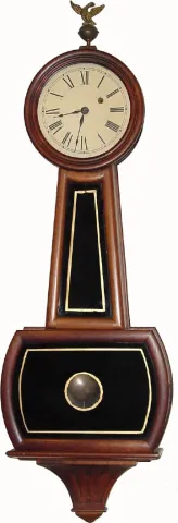 This weight banjo runs OK, but is assembled from various parts. The main case is an E. Howard No.4 (32"), with throat replaced, plus a New Haven bracket added to the bottom, and with home-painted tablets; the chimney and eagle are also afterthoughts. The movement is a Connecticut weight driven job with maintaining power (Terry/Thomas style with front hung pendulum). Lead weight is from something else altogether. Our estimate reflects the value of the parts. Total ht: 42"