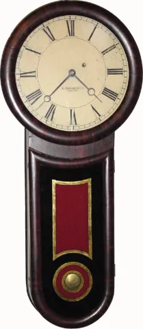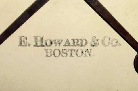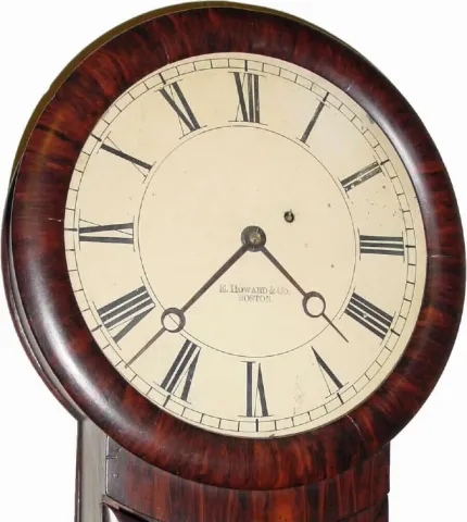 C.1874, Mixed lot: This is a rosewood grained case, probably by Hatch, now housing a signed Howard movement, dial, weight, pendulum and tiedown. The lower tablet has been repainted in the style of a Howard No. 11. The Howard dial is dirty and the signature is fading. The hands are period. Despite being a marriage, it is attractive and would look great on somebody's wall. Interestingly, this clock passed through John Delaney's hands in 1973, and is so noted on the rear of the dial and inside of the case. I am sure it was appropriately represented at the time. A real Howard 11 is worth around $3000+. Our estimate is based on the value of the parts. Height 33"