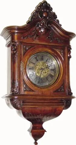 This is an attractive Austrian 2nd Baroque walnut wall case that got separated from its movement. Someone had the original dial and married it to a German, G. Becker movement that originally had a square dial (all this is obvious from the rear). Then to handle the placement of the winding holes, they soldered an engraved dial center to the front of the original dial. The well made Becker movement is in running order and strikes loudly on a new gong. Would be $1200 if correct. Height 36"