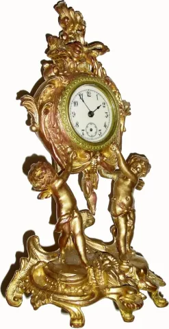 Movement complete with winder and setting knob. Cute case with two winged cupids holding up clock. Gilt on case is superb with some wear on a few high...