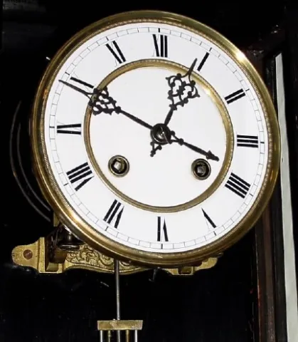 Regulator, with 8-day spring movement and "R-A" pendulum, with restoration. Some case trim has been replaced and the entire case re-blacked (looks OK)...