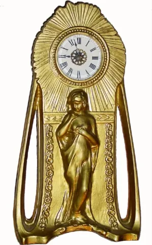 The iron case has been heavily sprayed with gold paint. A scantily clad young lady is standing in the garden, the clock in a large spray depicting the...