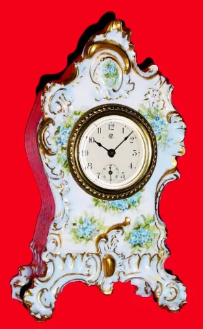 C.1905, Waterbury Clock Co., Waterbury, CT, 30-hour backwind miniature china case novelty, as-found with repairs.