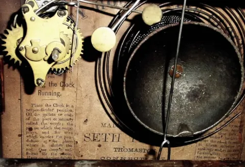 The dial has some paint flakes. There is some veneer lifting and chips on various parts of the case; someone has painted the columns and moldings on t...