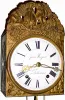 C.1890, French, Juan Neugart, Volladolid, 8-day time and strike Morbier wall clock. This is an anchor escapement model with gong strike, the gong attached to a board on the rear. The embossed brass dial surround depicts a group of young merry makers in a wheat field, and is in good condition. The grid pendulum has a little dent on the bottom, and has oxidized; it will polish up Ok; minor imperfections in dial; movement has been recently re-strung and is running and striking. The cast iron weights are old. Height 53"