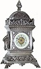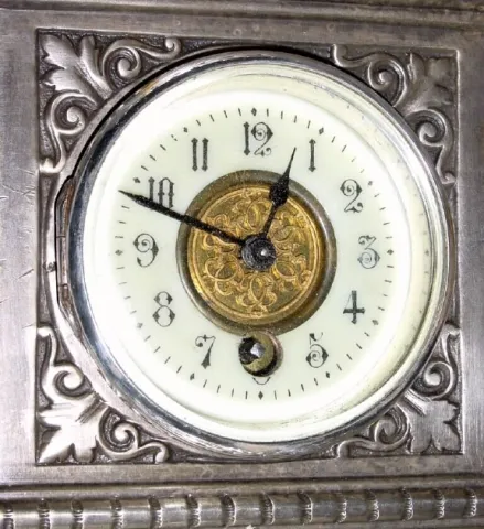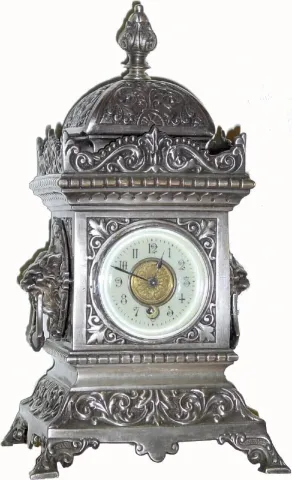 The case is silvered bronze and cast with scrolls and leaves and with a lion on each side. The miniature round movement is about 2 1/2" in diameter and with a platform cylinder escapement. The movement is in running order, but would benefit from cleaning. The porcelain dial is very good with no chips, and with a gilt bronze center. The very top finial is slightly bent. Note dimensions, as the clock looks larger than it is. Height 10 3/4"
