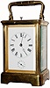 C.1909, French, Brass Cased Carriage Clock Grand Sonnerie, with alarm, in a Corniche case, in excellent original condition, recently cleaned and in good operating order. The porcelain dial is perfect, and the case retains original hands, lever platform, beveled glass and case hardware. The base with a selector lever and engraved choices of: Gde Sonnerie, Silence, or Hours and Quart's . A short description for a clean clock; ht 7"