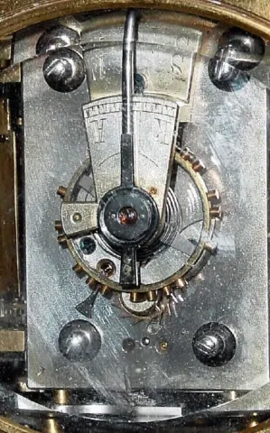 Grand Sonnerie, with alarm, in a Corniche case, in excellent original condition, recently cleaned and in good operating order. The porcelain dial is perfect, and the case retains original hands, lever platform, beveled glass and case hardware. The base with a selector lever and engraved choices of: Gde Sonnerie, Silence, or Hours and Quart's . A short description for a clean clock; ht 7"