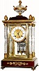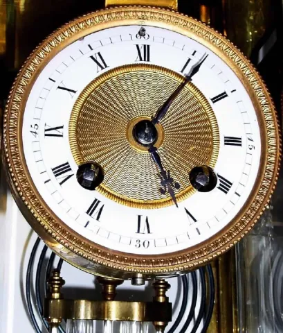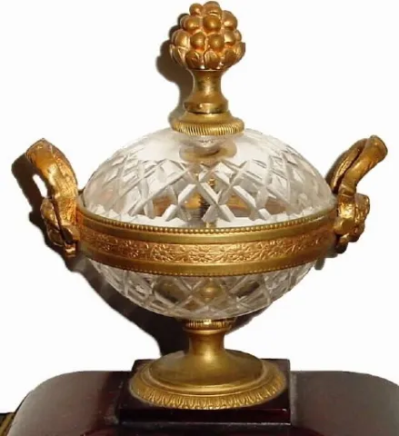 with cut and polished crystal columns (4) and matching cut crystal urn at top, and with mercury pendulum, the whole in very good condition. This is an exceptional clock, with only minor losses... a small and nearly invisible corner chip in the front door, minor abrasions on the dial and loss of gilding on the main part of the case. The case itself is a multi piece ormolu design, with mahogany base and top sections, offset with bronze mounts. The porcelain dial has an engine turned dial center with original gilding, the rack striking movement in operating order, signed simply "Made in France". If this were an American clock it would bring $3000. Suggest special packing for this fragile item. Height 15 1/2"