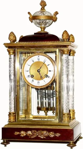 C.1905, French, Fancy Crystal Regulator with cut and polished crystal columns (4) and matching cut crystal urn at top, and with mercury pendulum, the whole in very good condition. This is an exceptional clock, with only minor losses... a small and nearly invisible corner chip in the front door, minor abrasions on the dial and loss of gilding on the main part of the case. The case itself is a multi piece ormolu design, with mahogany base and top sections, offset with bronze mounts. The porcelain dial has an engine turned dial center with original gilding, the rack striking movement in operating order, signed simply "Made in France". If this were an American clock it would bring $3000. Suggest special packing for this fragile item. Height 15 1/2"