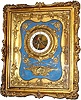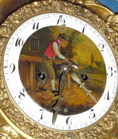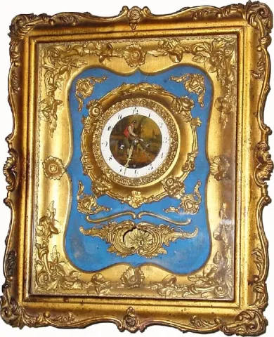 C.1820, Austrian, Animated picture frame clock. This clock is in excellent original condition; no effort has been made to clean the original gilding which has a mellow color. The silk thread movement strikes the hours and halves on a coiled wire gong, and a Tirolean wood cutter on the dial center swings his axe at the same time (one chop for each strike). The front frame has had its hinge renewed; otherwise an original piece. Height 20"