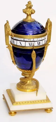 C.1895, French, Annular Dial Urn clock, bronze with blue cobalt finish and in good condition. The only things that keep this from being excellent are some minor hairlines on the dial plaques and a tiny outward dimple on the lower case (in rear) where someone slipped on re-installing the movement. Otherwise, this is a nice clock, with original gilding on the mounts and on the snake, whose tongue points to the time. Very eye catching blue-gold combination. Height 91/4"