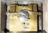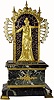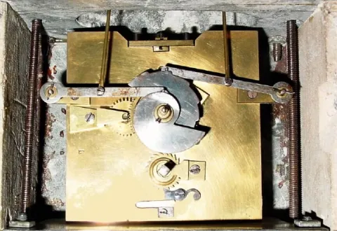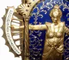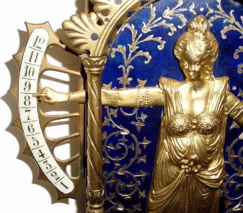The case is in the form of a gowned lady standing within an ormolu arch against an enamel background, and raising her arms to indicate the time on two flanking enamel chapter sectors (hours at left, minutes to the right, arms fall when they reach the top). The rectangular plated movement with platform escapement (cylinder), contained in a rectangular marble base, dark variegated green, with ormolu mounts. The base has a front to back glue repair (well done) and the feet have been glued on as well; minute track is perfect; hour track has a crack through the numeral 10 (difficult to see). A similar clock, with white marble base sold at Sotheby's Meraux sale, June 28, 1993, lot 81 for $12,075, and further information may be found in Derek Roberts' book: Mystery Novelty and Fantasy Clocks, (1999), page 93. Height 17"