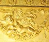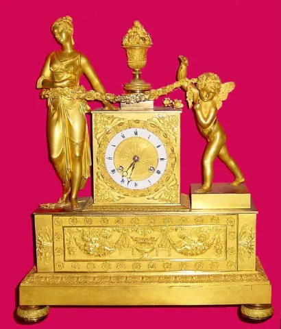 C.1825, French Ormolu Figural clock in excellent original condition. The case, depicting a pensive lady to the left with a winged cherub to the right, a garland stretching between them. The well made movement is finely finished, devoid of markings, except for a small number 27, has silk thread suspension, with count wheel striking on a bell. Movement recently cleaned and running; gilt dial center with fancy engine turned pattern. The only things that keep this from being outstanding are a small chip near 3 on the porcelain dial and a solder repair to the long garland. Height 17.5"