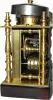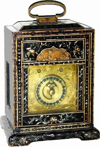 Mid 1800s, Japanese, Bracket Clock, time and strike, in a miniature MOP covered case with sliding front and rear panels. This was made before Japan adopted Western time keeping around 1873. The case is in exceptional condition, with intricate floral displays on all surfaces. The fusee movement, with verge is controlled by a balance rotating under the bell (with a little "heartbeat" arrangement to show it is running). The dial rotates behind a single vertical hand, and with calendar indications showing in two little openings below the time dial, one showing the 12 Terrestrial branches, and the other the 10 Celestial branches, the dial plate with intricate floral engravings. With original winding key in hidden drawer. Note small size: ht of mov't 4", height of case 6"