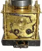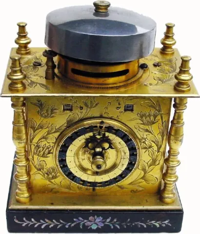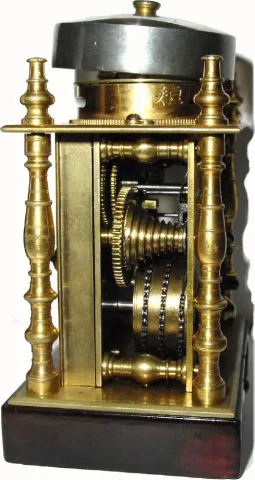 This was made before Japan adopted Western time keeping around 1873. The case is in exceptional condition, with intricate floral displays on all surfaces. The fusee movement, with verge is controlled by a balance rotating under the bell (with a little "heartbeat" arrangement to show it is running). The dial rotates behind a single vertical hand, and with calendar indications showing in two little openings below the time dial, one showing the 12 Terrestrial branches, and the other the 10 Celestial branches, the dial plate with intricate floral engravings. With original winding key in hidden drawer. Note small size: ht of mov't 4", height of case 6"