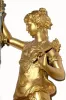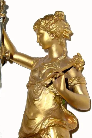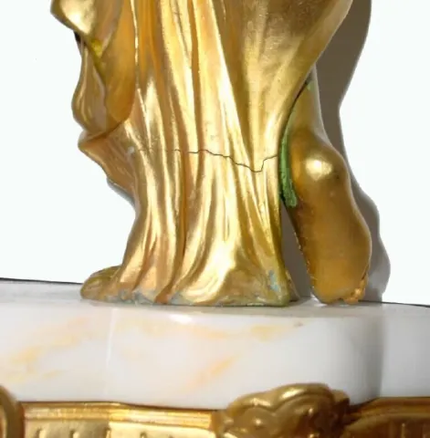 C.1880, Rare French Glass Dial Mystery Clock, the swinging arm held aloft by a gilded female statue. The movement is in the ball at the bottom of the arm, and powers the arm, suspended by a normal suspension spring. A separate miniature gravity movement is in the center of the glass dial, with a tiny pendulum and ratchet that advance the well balanced hands with each swing of the arm. This clock has been professionally restored, and the ball and statues attractively refinished; there is an old crack near the base of the spelter statue, visible from the rear (does not go all the way through). It is in running order. Numerals on dial are gold leaf, but appear brown because of back lighting in photo. Dial diameter is 7 inches (17.8 cm), overall height is 24 1/2" Will be disassembled for shipment.