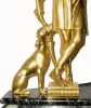 figural clock in generally good condition. The two minuses are: the bezel is slightly sprung and will not stay shut, and the F/S rod has been removed from the movement, so all adjustment is through the nut on the pendulum. Some wear to the painted numerals on the gilded dial also. These points aside, this is a good looking clock depicting a young man in a tunic with his hunting equipment: horn for calling, his bow and his retriever. All the bronze is finely chased and with original gilding intact. Height 13"