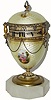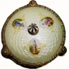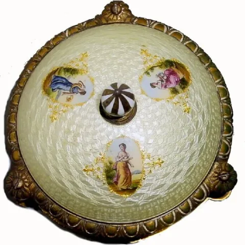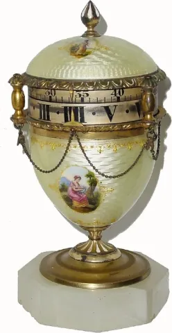 opalescent yellow enamel over silver, with hand painted cherub displays. The silver has a gentle damascene pattern that reflects through the translucent yellow enamel. The case hardware is gold over silver (excluding movement and dial), with some oxidation. The top has 3 ladies in various dresses (in cameos), while the front cameo shows a lady doing knitting or needle point. Minor losses along bottom edge of marble base; enamel work is perfect. These were expensive gifts when new, and this is a nice example. Height 7 1/4"