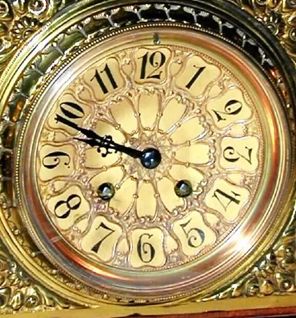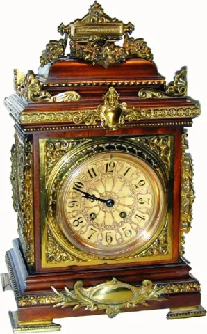 This clock is made in the German style with around 20 separate pieces of heavy brass trim. All of the pieces are intact, and the case retains original finish. The well made square French movement is numbered 1661 and with matching number on pendulum. The heavy ormolu dial has a fancy cast overlay mask. A very impressive clock. Strikes the hours on a heavy coiled wire gong. Height 17 1/2"
