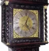 The case of this clock is heavy oak, carved in country fashion, a geometric scrolly design, the hood with the admonition: "Lose No Time". Note the carving was normally done later to keep up with styles of the day. There are some loose glue blocks and the right side throat return is loose and needs gluing. The movement has been cleaned and re-cabled and is in running order. The 12" dial has cast cherub spandrels, and a matte center with foliate engraving. Height 87"
