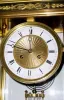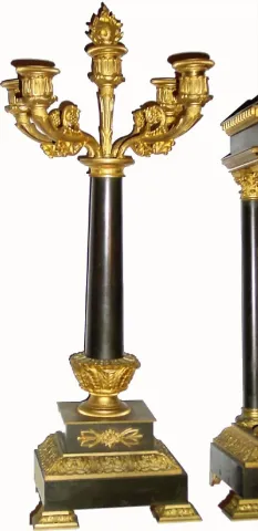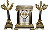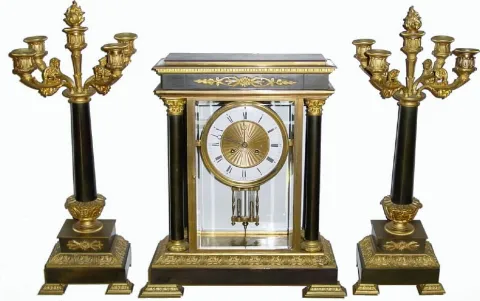 This is a large and impressive 2-tone bronze set of high quality that will respond well to replacement glass from Grays in TN (or enjoy as-is if you're not fussy). The finish on the case and candelabras is still quite good; minor imperfections. The quality round movement is signed simply "A-1", strikes the hours on a coiled flat wire gong; the porcelain dial is clean (minor crack below 6)and offset by an engine turned center. Mercury pendulum is intact. The matching candelabra hold five candles each and are quite elegant. Height 19"