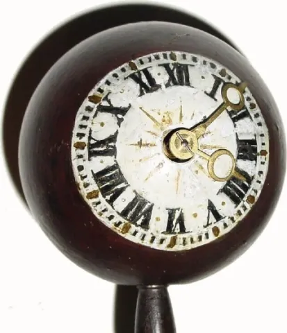This is a very uncommon model, the tiny 7-day platform movement contained within the 2 inch ball held in the jester's hand, (ball is removable for winding and shipping). Movement is wound with a regular key through a hole in the rear of the ball. Dial with some touch-up to numerals. Height 17"