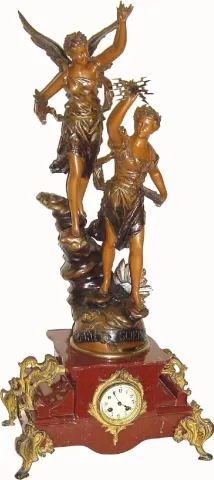 (Gandenie Rande compensande) in very good original condition. This is a wonderful theme and suitable even for today, and the condition of the statues is wonderful. The heavy red marble base is in good condition and all 4 gilt spelter feet are intact. The well made bell strike movement is running, but would benefit form service. This is a large and impressive piece (will be disassembled for shipment). Height 37"