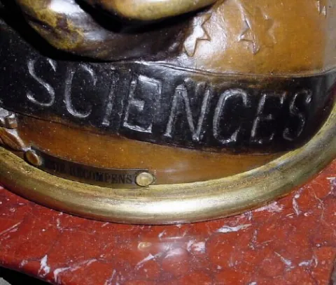 C.1900, French, Patinated Spelter double statue clock "The Sciences - Ingenuity Rewarded" (Gandenie Rande compensande) in very good original condition. This is a wonderful theme and suitable even for today, and the condition of the statues is wonderful. The heavy red marble base is in good condition and all 4 gilt spelter feet are intact. The well made bell strike movement is running, but would benefit form service. This is a large and impressive piece (will be disassembled for shipment). Height 37"