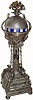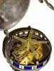 time and strike, in an unusual case of cast iron together with hammered iron designs. First, the pendulum is a modern replacement that is not suitable, although the clock will tick with it. Aside from this, it is a very high quality movement with a complex contrate wheel set up coming off the front of the movement and transferring power up to the top center of the movement, where a five spoke hub fans out to carry the single hour annular dial in blue, black and gold. Between the black and white numeral shield are the signs of the Zodiac in gold. I imagine it had some type of hammered iron pendulum. Very heavy. Height 28 1/2"