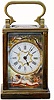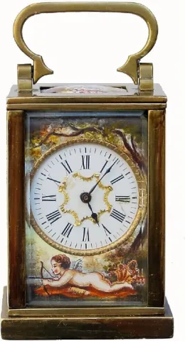 C.1900, French, Miniature Brass Cased Carriage Clock with enamel panels on both sides, front and top. This is a tiny clock, 3 1/2" including handle and 2 1/2" the case only. The top panel shows a pair of doves, the front panel with cupid shooting an arrow and the side panels showing two lovers in gaily colored clothes. The very small movement is a proper clock movement, with a tiny lever platform spanning the top of the plates. The only flaws in the clock are a tiny chip in one corner of the front beveled glass, and a hairline in the porcelain dial at 3. 3 1/2"