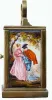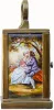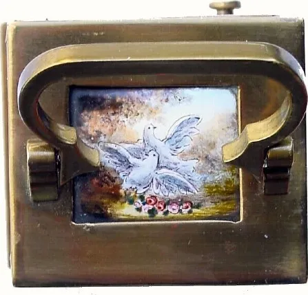 with enamel panels on both sides, front and top. This is a tiny clock, 3 1/2" including handle and 2 1/2" the case only. The top panel shows a pair of doves, the front panel with cupid shooting an arrow and the side panels showing two lovers in gaily colored clothes. The very small movement is a proper clock movement, with a tiny lever platform spanning the top of the plates. The only flaws in the clock are a tiny chip in one corner of the front beveled glass, and a hairline in the porcelain dial at 3. 3 1/2"