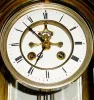 This is a large and heavy clock with a 5 1/2" dial, and with brocot escapement on the dial; note minute hand is about half an inch too short. There are some hairline cracks in the chapter ring at 6 o'clock. The center dial is perfect. The case has been cleaned and polished and is very nice condition. The beveled glass panels are perfect, and with large brass pendulum with grid support. Height 18 1/2"