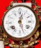 A lady in Manchester brought this clock to us, and the round bell strike movement is running fine. The only minor fault is the F/S rod is missing from the top of the movement, so you have to do all F/S adjustment with the pendulum bob. Fancy porcelain dial is still good with only minor abrasion by left winding hole. A decent European piece for the beginning collector. Height 16 1/2"