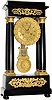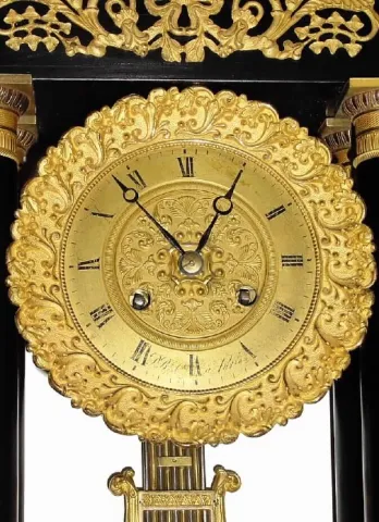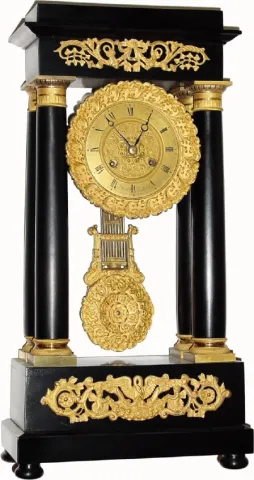 C.1865, French, 4-Column Empire style mantel Clock, with restorations. The case has been completely refinished in black and rubbed down to a soft sheen. The mounts have nice detail, and retain original gilding; the lower frieze of a spread winged swan and two winged cherubs. The movement has been recently cleaned and is in running order; strikes the hours on a bell; no markings except a number; dial has a name and "Paris" with some wear. Pendulum with floral themes retains original gilding. Overall a good looking clock in good condition. Height 20"