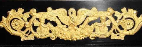 The case has been completely refinished in black and rubbed down to a soft sheen. The mounts have nice detail, and retain original gilding; the lower frieze of a spread winged swan and two winged cherubs. The movement has been recently cleaned and is in running order; strikes the hours on a bell; no markings except a number; dial has a name and "Paris" with some wear. Pendulum with floral themes retains original gilding. Overall a good looking clock in good condition. Height 20"