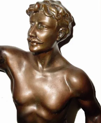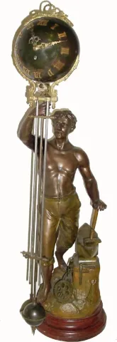 C.1890, French, Large Male Figure Swing clock. The statue is patinated spelter in excellent original condition. Note industrial themes, with hammer, anvil, gears and 3 iron working tools. The minus on this clock is that the swinging arm has been dropped at some time and the top ball damaged and straightened. Creases are evident in the rear hemisphere, and it still has a skew to the right, therefore the beat adjustment has had to be set at one side to get the clock to run. Some one with skill in working with brass could improve the alignment of the ball. Would have brought $6000 without the damage. Height 37"