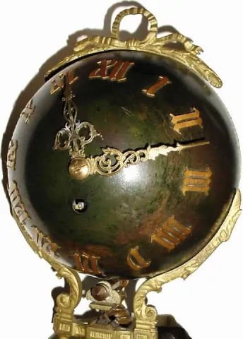 The statue is patinated spelter in excellent original condition. Note industrial themes, with hammer, anvil, gears and 3 iron working tools. The minus on this clock is that the swinging arm has been dropped at some time and the top ball damaged and straightened. Creases are evident in the rear hemisphere, and it still has a skew to the right, therefore the beat adjustment has had to be set at one side to get the clock to run. Some one with skill in working with brass could improve the alignment of the ball. Would have brought $6000 without the damage. Height 37"