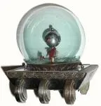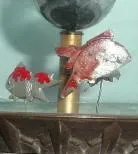 C.1950, Japan, Art Deco Annular Dial clock, with animated fish in globe . This is the most desirable of all of these little orbital dial clocks. The smaller fish wiggles back and forth with each tick, and the larger fish does a full 360 degrees, one tick at a time. There is minor loss of chrome on the 6 saucer feet, but over this is in Excellent Original condition. Height 5"