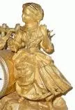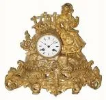 This clock must have spent its life under a dome, as the original frosty yellow gilding is still very bright (there is minor separation of gold from the base metal in a couple of places). The case depicts a young girl holding a long skein of yarn. (the top end of the skein has come loose from her hand but can be simply re-attached, also her left index finger has been missing for some time, only visible on close inspection). The well made bell strike movement is in good order, and with excellent dial and original hands. Height 12 1/2"