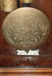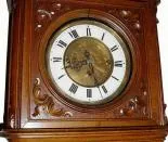. The walnut double door case has nicely carved accents; top left return molding has been re-glued a bit crooked and the case has been varnished over the entire surface; other minor nicks. At some time someone has installed a matched set Remember movement (dial center, weights and pendulum retain original scroll pattern engraving in nice condition). No holes are visible in the back, but an extra set are visible when you remove the mounting bracket. The movement will need service, but is ticking and striking. An impressive clock that will respond to restoration. Height 48"