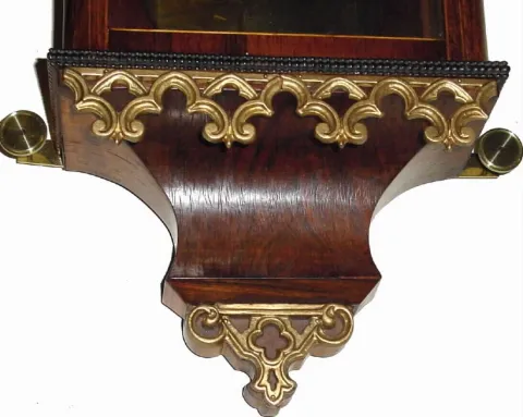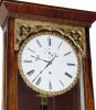 This is a well made clock with 5 wheel train (winds left). The 72 beat movement and mounting bracket are original to the case; mounting bracket has been repaired where one stud pulled out previously (now soldered). The one piece dial and cast bezel are original. There is a slight warp to the case, top right trending to the rear. Front door glass is original with spots and fish eyes. The pendulum is brass both front and rear; small dimple in center. The rosewood veneer on the case is very nice, and with contrasting banding around the entire case; there are some minor veneer losses on the top left return and top right of the door. Note also cast and gilded metal trim on door top, below bottom deck and on tail piece. In good running order. Height 40"